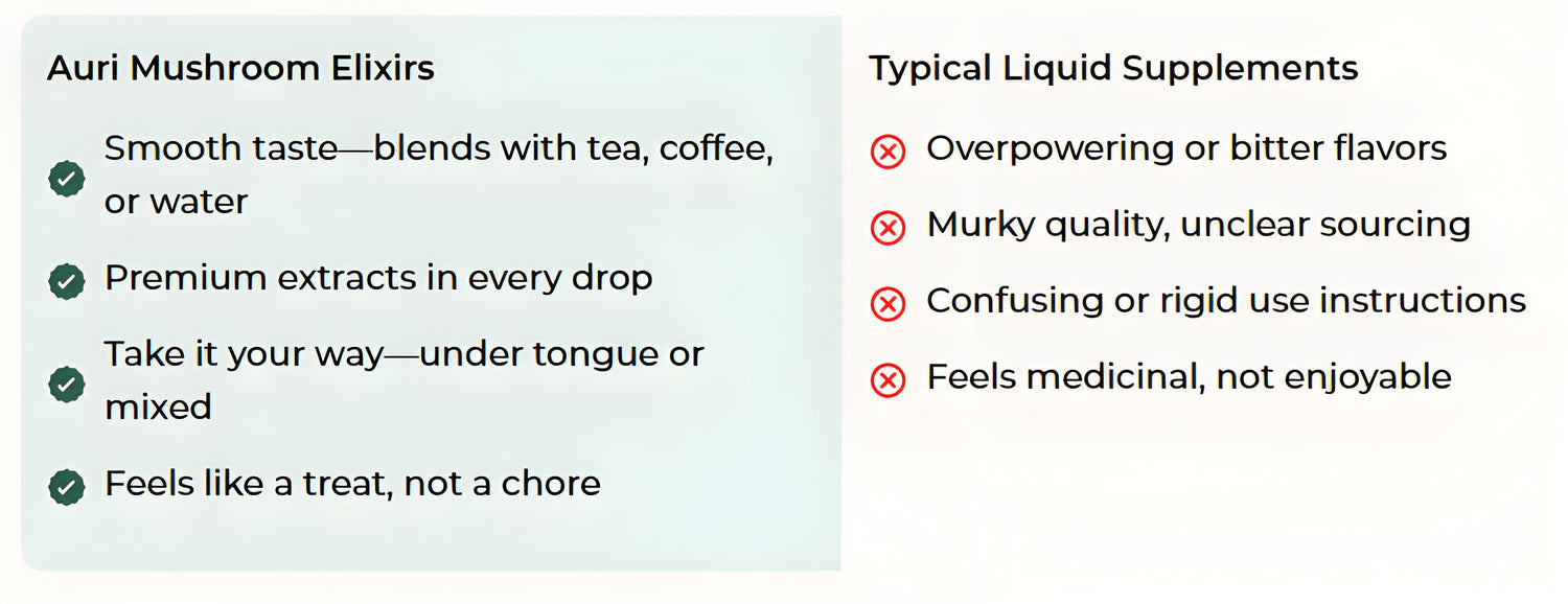Auri Elixirs are crafted to blend into your coffee, tea, or water — smooth, delicious, and designed for your daily wellness routine.