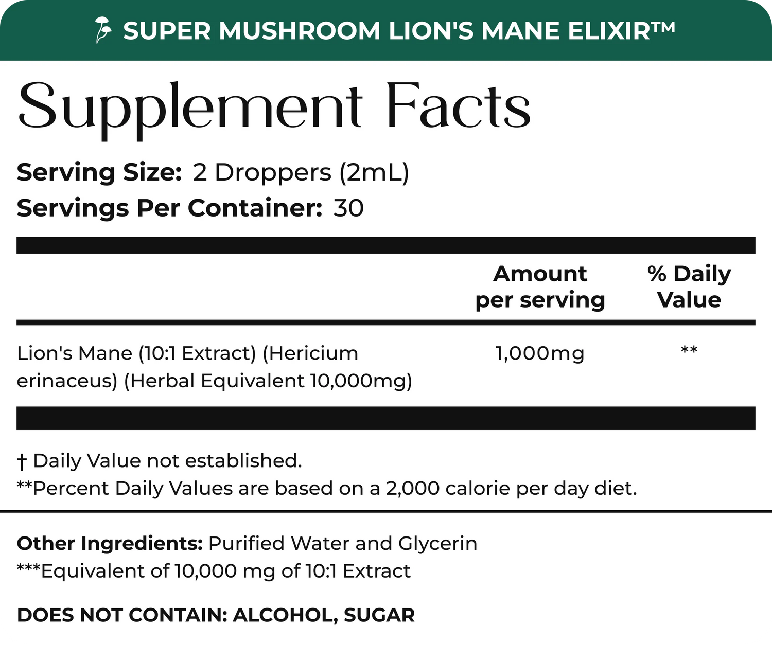Our Lion’s Mane Elixir uses high-quality Lion’s Mane extract sourced from trusted growers and selected for purity and consistency.